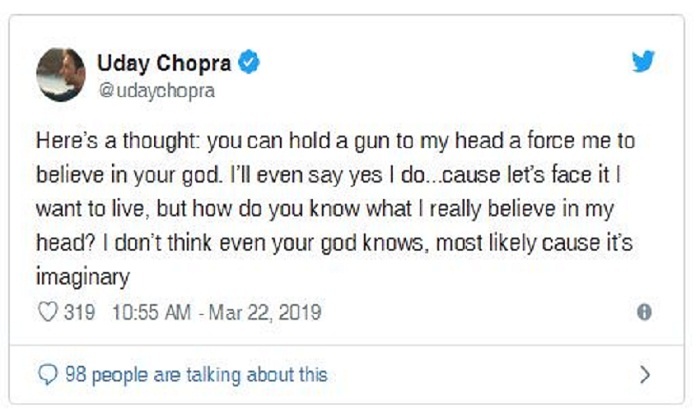 उन्होंने आगे पोस्ट किया- ”मैं ठीक नहीं हूं। मैं कोशिश कर रहा हूं लेकिन असफल हो रहा हूं। हालांकि बाद में उदय ने इन ट्वीट्स को डिलीट कर दिया और फिर नास्तिकता को लेकर एक और ट्वीट किया। उन्होंने लिखा-”यह एक विचार है: आप मेरे सिर पर गन रखकर मुझे भगवान पर विश्वास करने के लिए फोर्स कर सकते हो। मैं हां भी कर दूंगा क्योंकि मैं जीना चाहता हूं। लेकिन आपको कैसे पता चलेगा कि मैं किस पर विश्वास करता हूं और मेरे दिमाग में क्या चल रहा है। यहां तक कि यह बात भगवान को भी नहीं पता है। सबसे अधिक संभावित कारण यह काल्पनिक है।